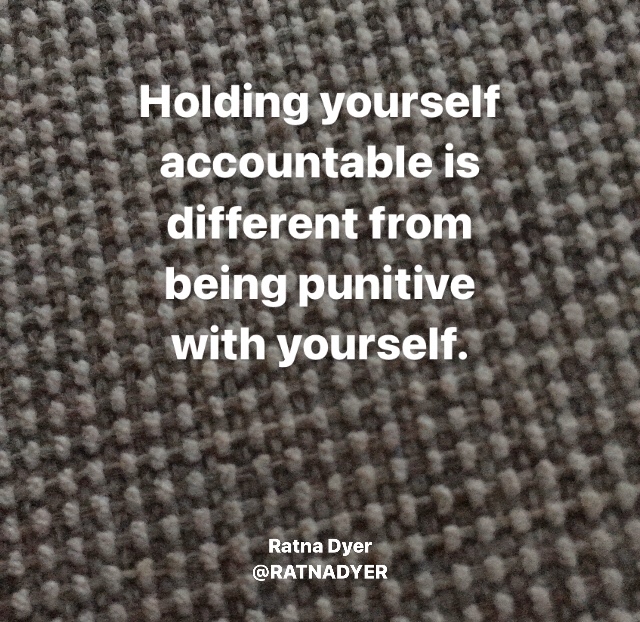 Holding yourself accountable is different from being punitive with yourself. January 19, 2022 by ratnadyer Yes take responsibility. But be kind. Share this: Click to share on X (Opens in new window) X Click to share on Facebook (Opens in new window) Facebook Like Loading...