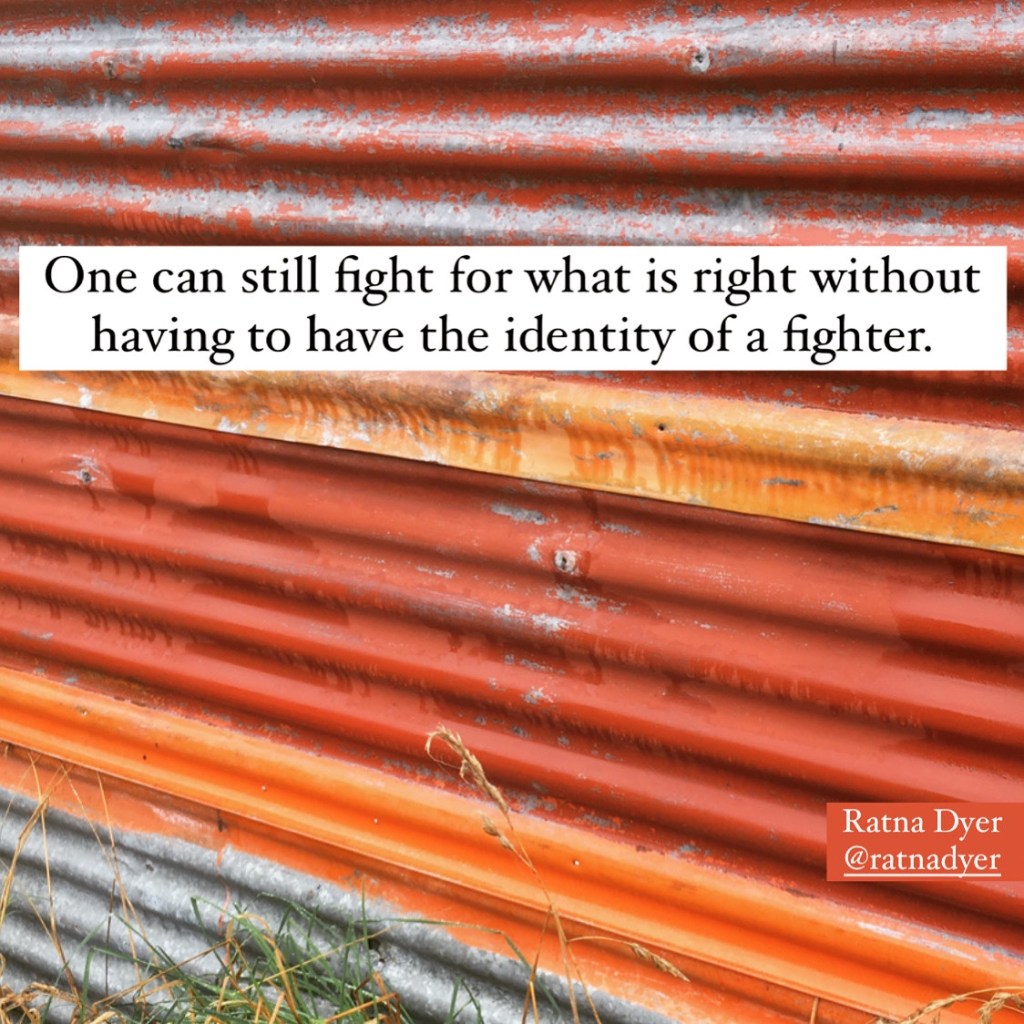 One can still fight for what is right without having to have the identity of a fighter. April 30, 2022 by ratnadyer When we are attached to an idea about ourselves and our identity, we are actually further away from the truth of who we are. Share this: Click to share on X (Opens in new window) X Click to share on Facebook (Opens in new window) Facebook Like Loading...