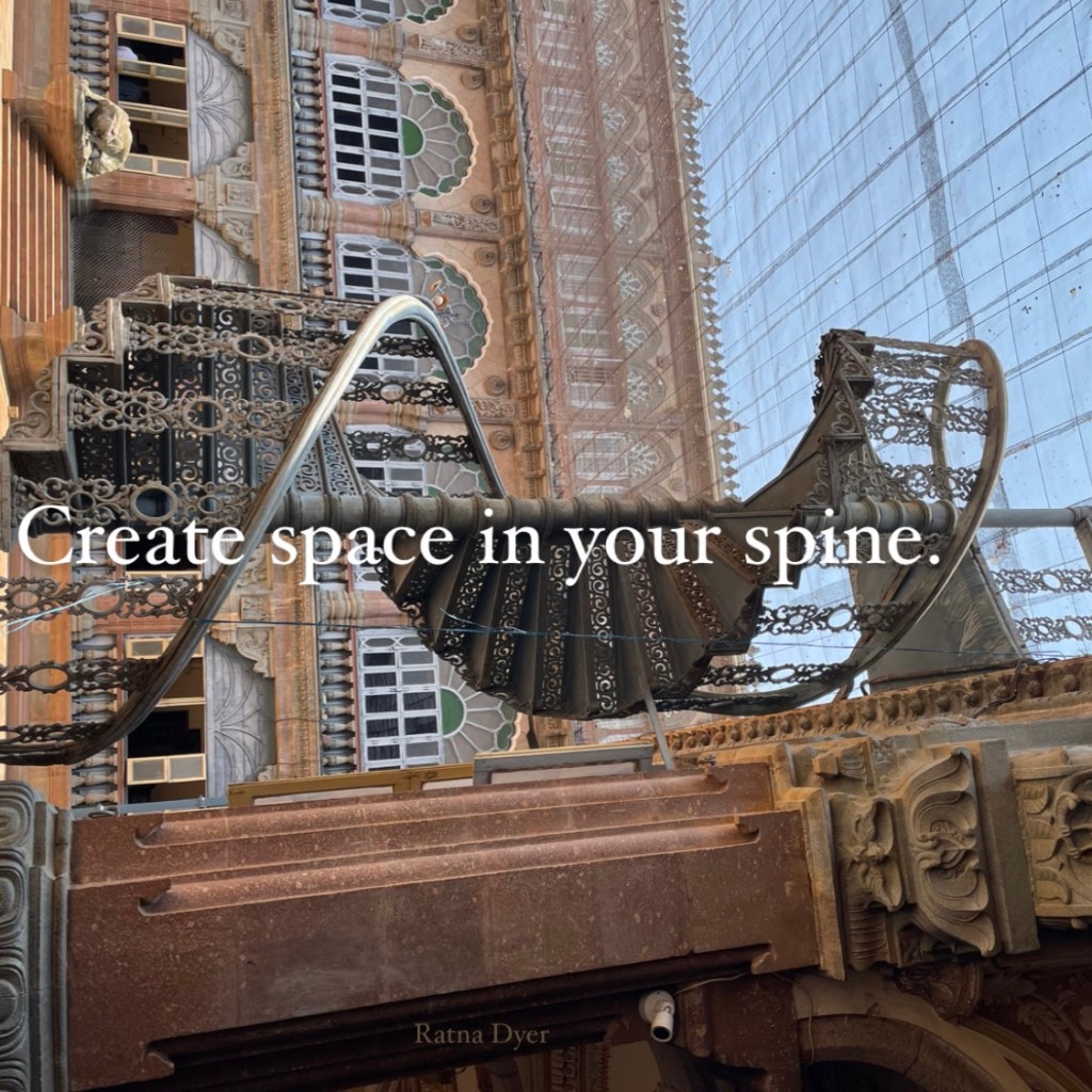 Create space in your spine. April 23, 2023 by ratnadyer Creating space in our body is a pathway to create space and peace in our inner being. Share this: Click to share on X (Opens in new window) X Click to share on Facebook (Opens in new window) Facebook Like Loading...